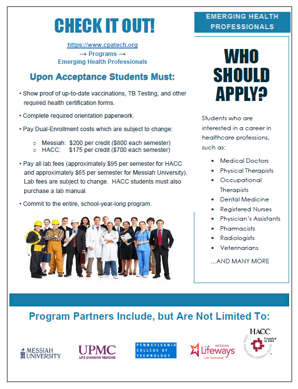 The Cumberland Perry Area Career and Technical Center (CPACTC) would like to share an exciting opportunity for rising high school seniors interested in continuing their education in the healthcare field. The Emerging Health Professionals program (EHP) is a unique, half-day, full-year dual enrollment program that combines earning 11 college credits with gaining first-hand shadowing experiences in a variety of clinical settings. Please see the attached flyer and visit our website at https://www.cpatech.org/page/emerging-health-professionals for program requirements and additional information about this tremendous opportunity. Thank you! Kristi Kennedy